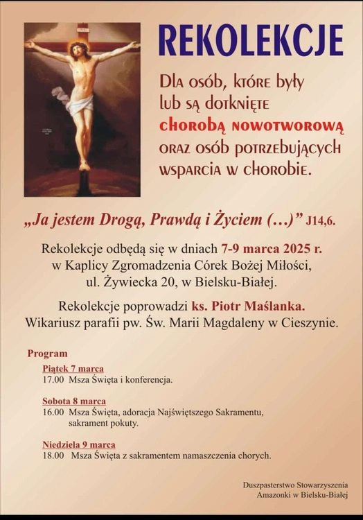 Wydarzenie, którego organizatorem po raz kolejny jest Duszpasterstwo Stowarzyszenia Kobiet po Mastektomii „Amazonki” wraz ze swoim duszpasterzem ks. Wojciechem Olesińskim, odbędzie się w dniach 7-9 marca w kaplicy Zgromadzenia Córek Bożej Miłości w Bielsku-Białej. To wielkopostne spotkanie adresowane jest do osób dotkniętych chorobą nowotworową oraz ich rodzin, a poprowadzi je ks. Piotr Maślanka, wikariusz w parafii pw. św. Marii Magdaleny w Cieszynie.