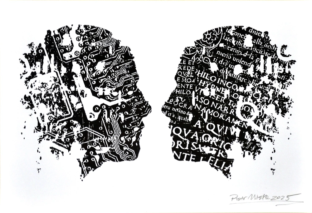 Piotr Czadankiewicz, Niech mowa wasza będzie tak tak, nie nie (Mądrość Syracha i supermarket idei), 2025.Niewątpliwym walorem zatrzymania się na wystawie prezentowanej w Galerii PPP jest też dość różnorodny zestaw technik plastycznych: od grafiki warsztatowej, grafiki cyfrowej i plakatu, przez malarstwo, rysunek, collage, po różne techniki autorskie.